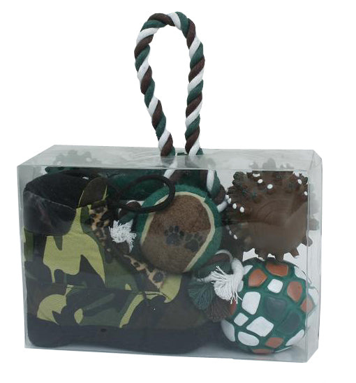 Our 'Pet Life' Camouflage "Hunter" themed Pet Toy Gift Set comes with 1 Chew Boot, 1 Tennis Ball, and 2 Rubberized Chew Toys. This product comes packaged in a presentable 'Gift Ready' PVC packaging kit. Pamper your pet with the ultimate Holiday gift set!
