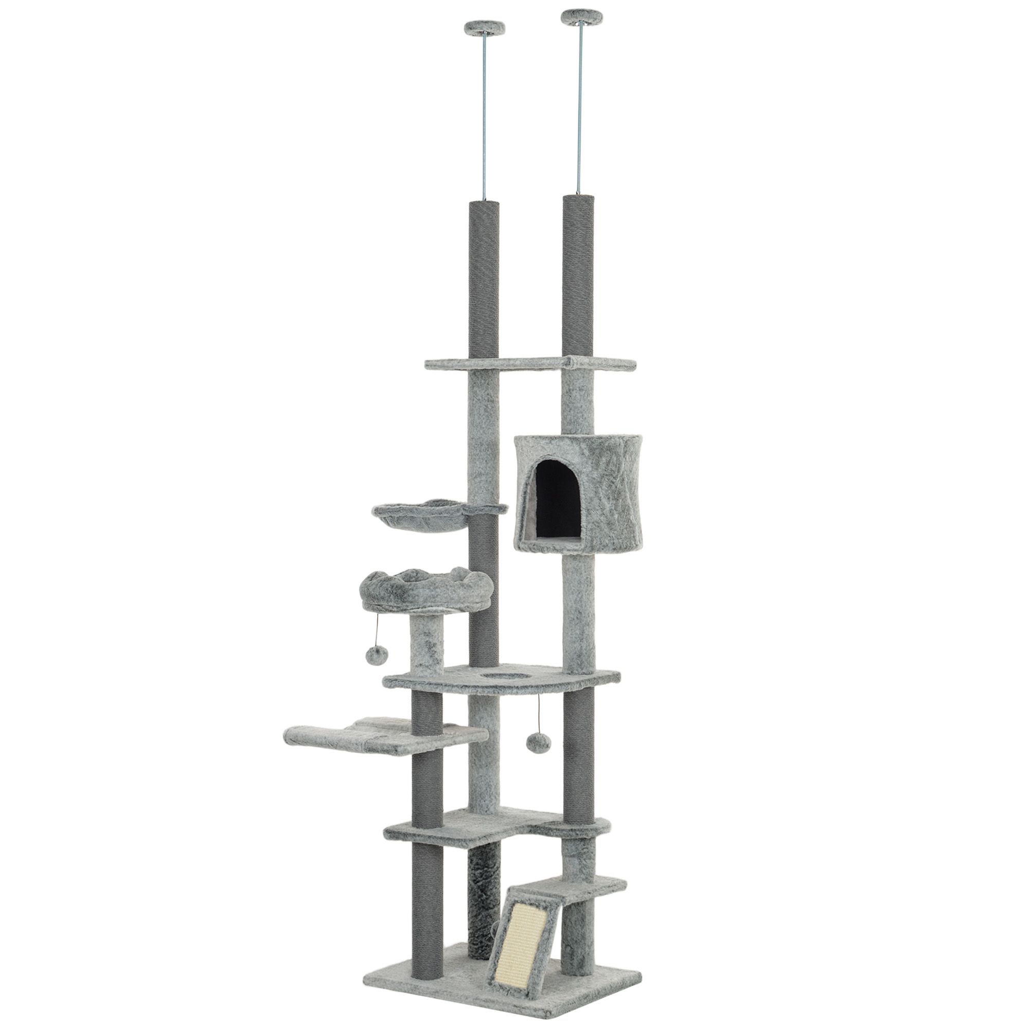 Elevate your cat's playground with the PawHut tall cat tree! This adjustable, floor-to-ceiling tower fits spaces from 88.6" -100.4" (225-255 cm), featuring a space-saving design that offers endless fun. It includes cozy cat hammocks and multi-level platforms for climbing, plus a secure cat condo and perch, all wrapped in soft velvet for luxurious comfort. Suitable for homes with two cats, each up to 11 lbs(5kg).