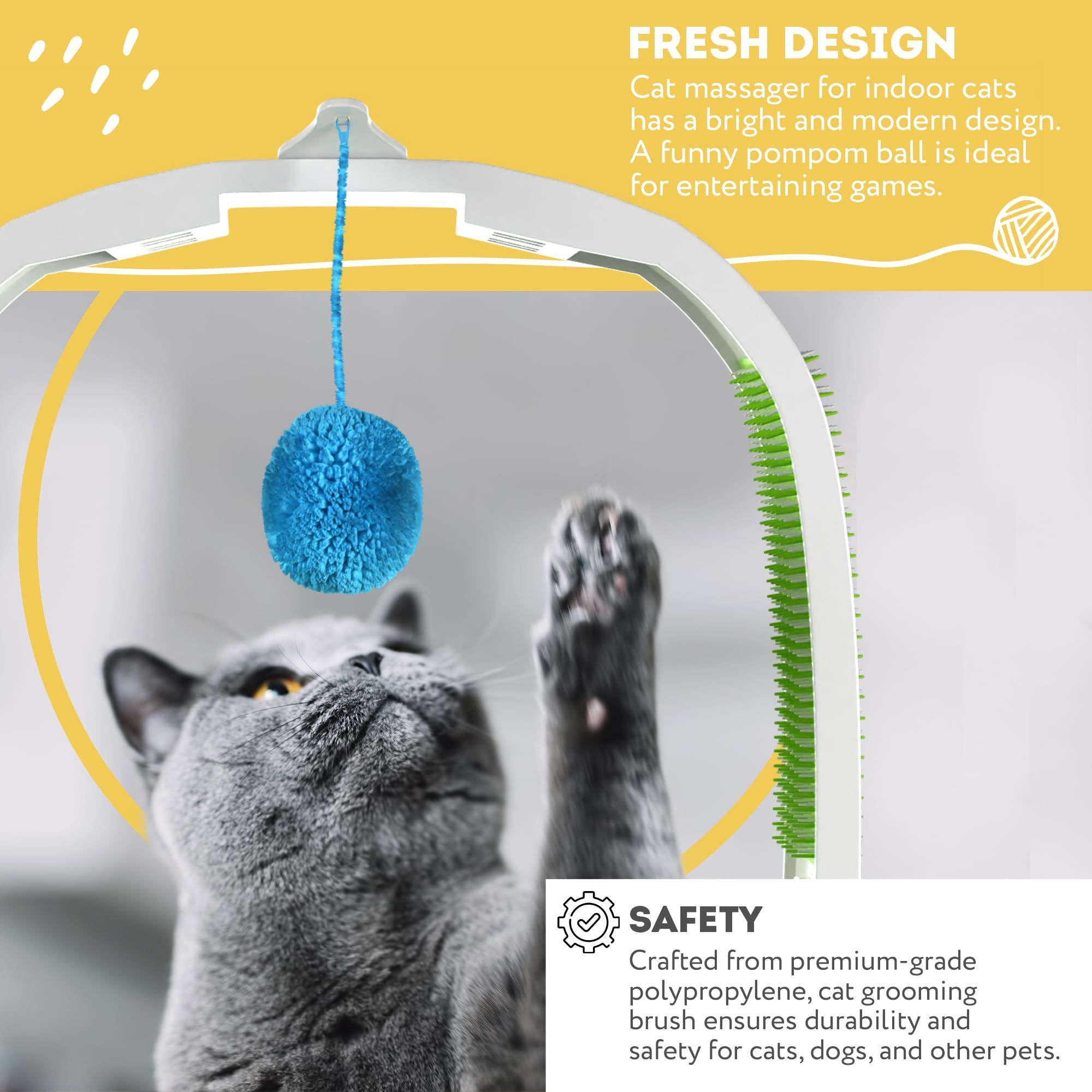 3.Fresh Design. Cat massager for indoor cats has a bright and modern design. A funny pompom ball is ideal for entertaining games. Cat self scratcher is securely fixed to the base and will not bounce during play.