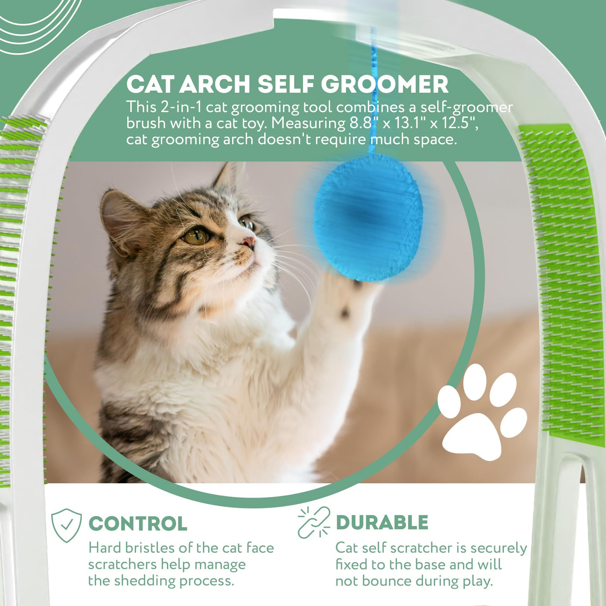 1.Cat Arch Self Groomer. This 2-in-1 cat grooming tool combines a self-groomer brush with a cat toy. Measuring 8.8 x 13.1 x 12.5 inches, cat grooming arch doesn't require much space, and a secure, non-slip design ensures stability during use.