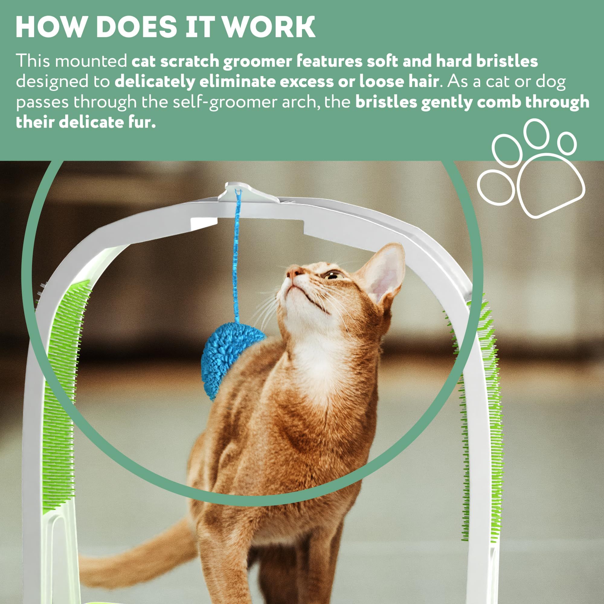 4.How Does It Work. This mounted cat scratch groomer features soft and hard bristles designed to delicately eliminate excess or loose hair. As a cat or dog passes through the self-groomer arch, the bristles gently comb through their delicate fur.