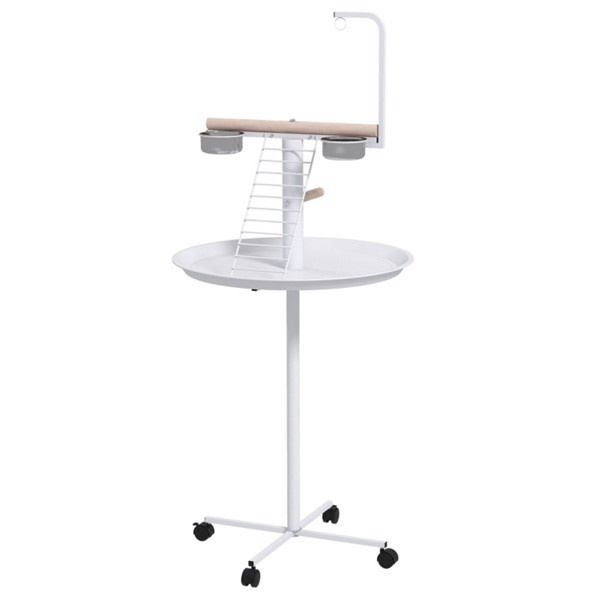 • - It includes a perch, a ladder, and a boom for birds to rest and play