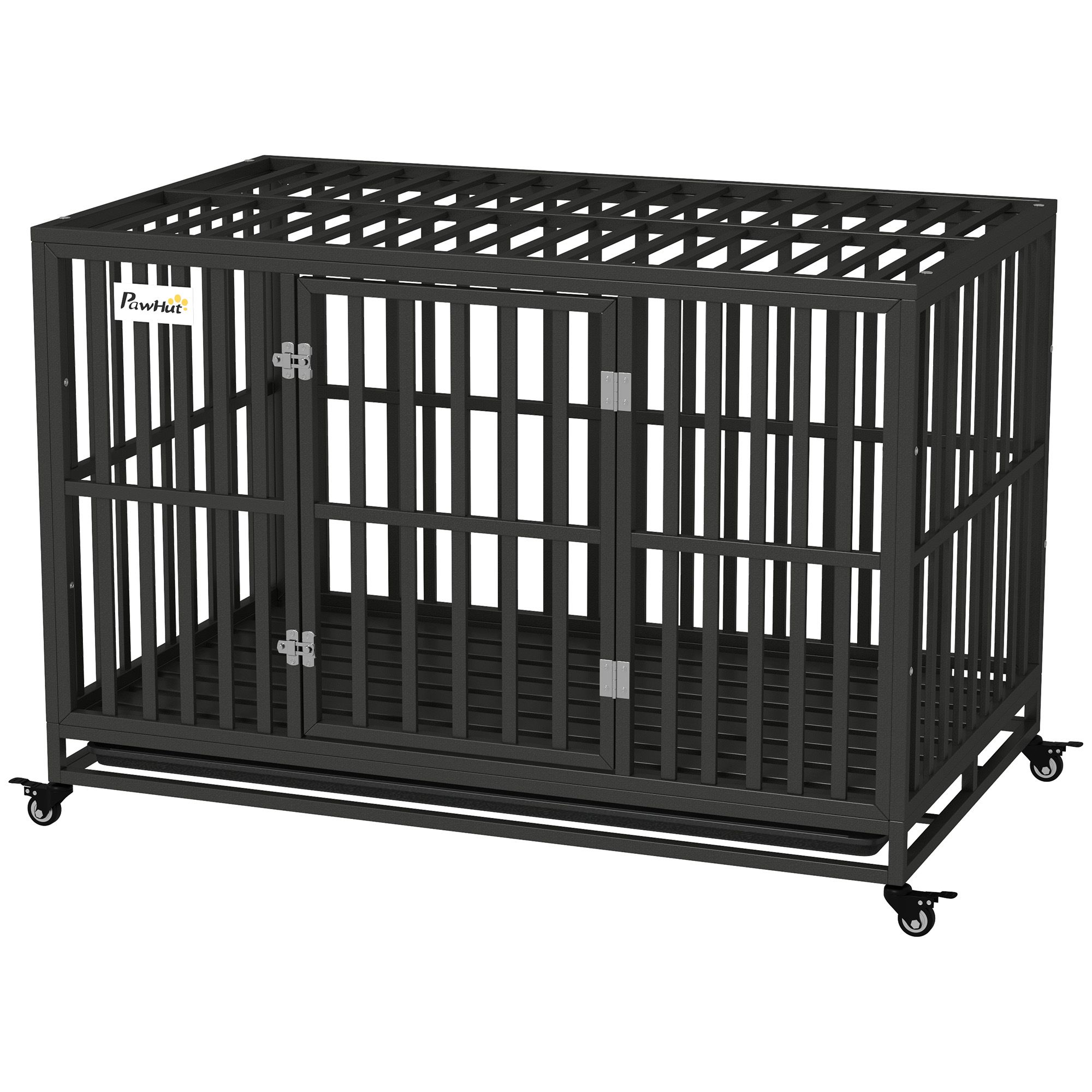 This heavy-duty dog kennel from PawHut provides a comfortable and secure home for your furry friend. Constructed with solid steel gauge tubes and frame. Each bar is securely welded to the frame for long-lasting strength and durability. A convenient slide-out panel is included for easy cleaning and maintenance. This dog kennel has rolling caster wheels for easy transportation and movement. This crate is a great tool for keeping your pets safe and secure while you are away.