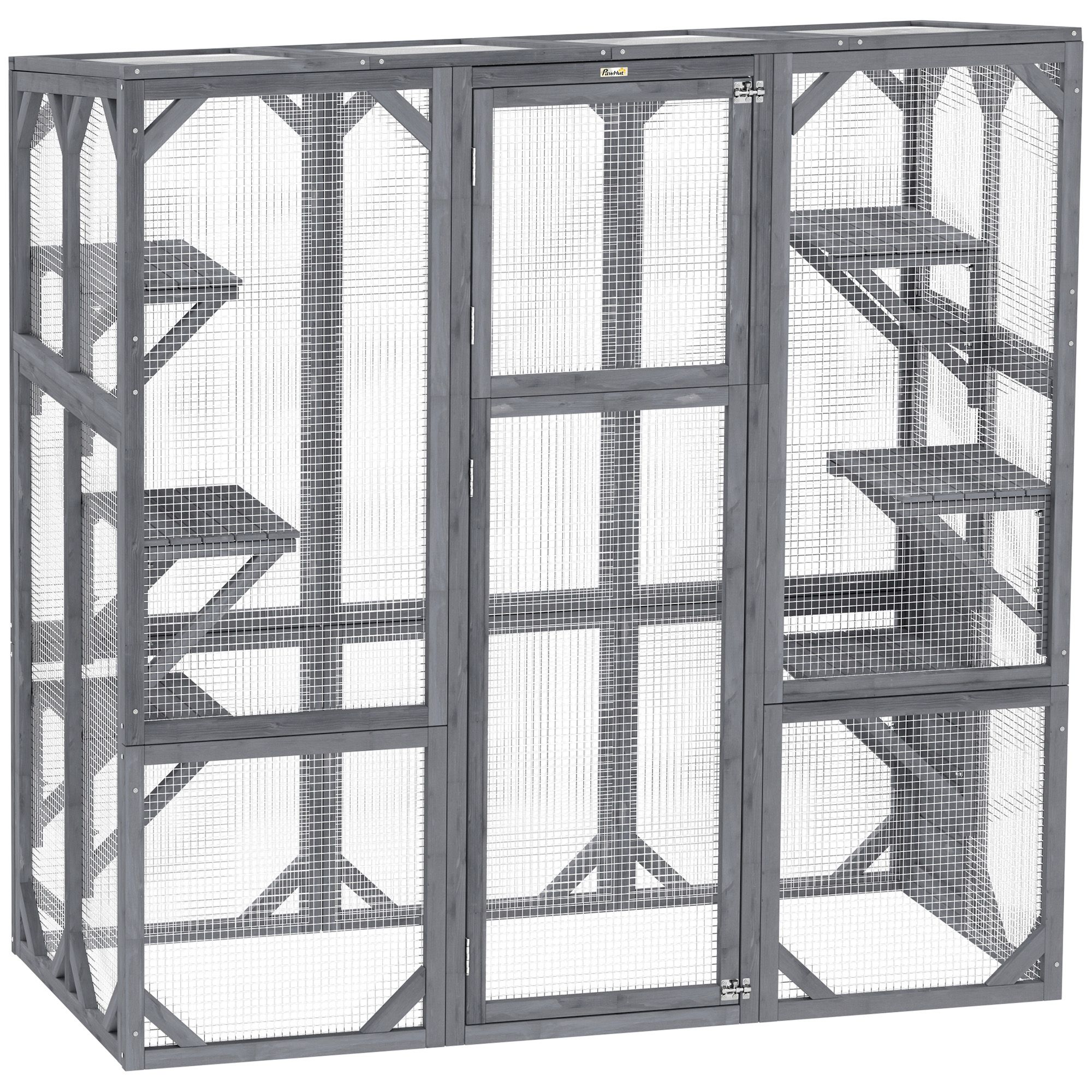 Home > Outdoor Cat Enclosure with 6 Jumping Platforms, Weatherproof Roof, Large Front Door for 1-3 Cats, 59" x 28" x 60", Grey