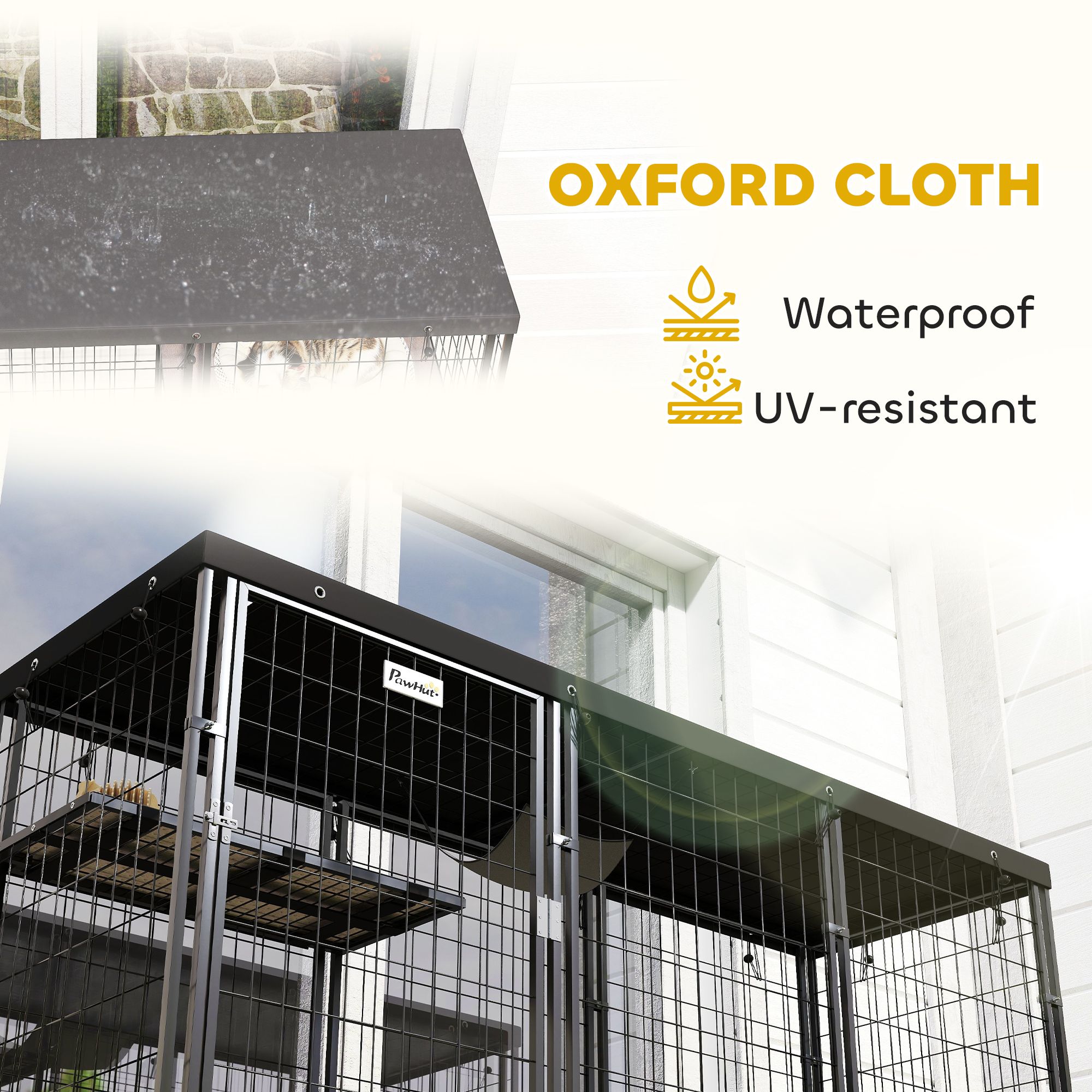 • • Waterproof and UV-resistant cover protects cats from elements