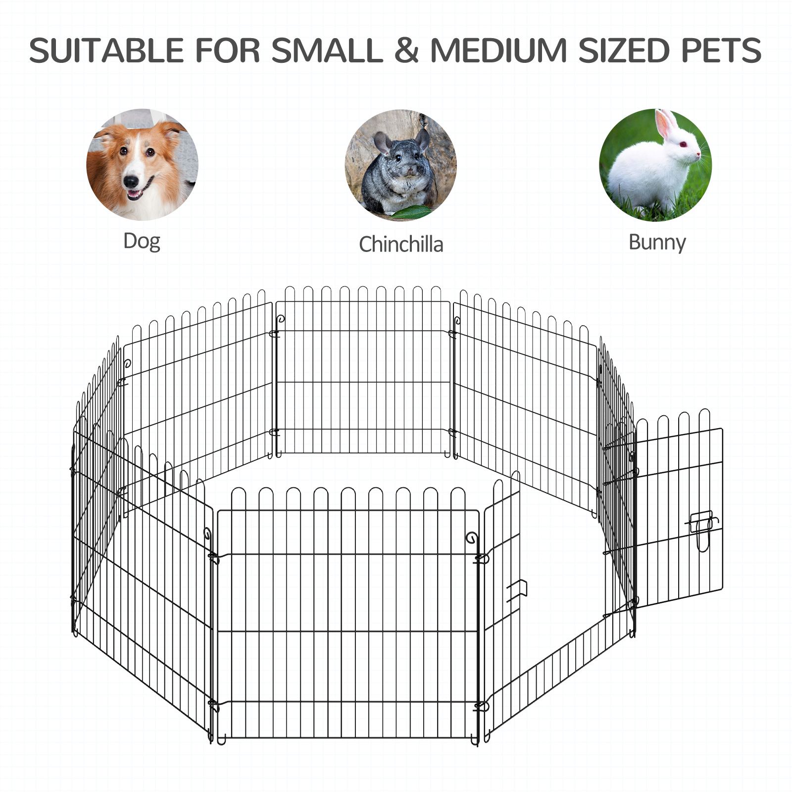 This pet playpen from PawHut is perfect for a variety of pets, dogs, bunnies, guinea pigs and more. 8 durable panels could be folded up for easy storage. Sturdy metal wire with anti-rust coating ensures long lasting use. Two door locks for extra security. It will be a secure protection area for your pets' living and romping around outdoors without your worries. Foldable and easy to setup with no extra tools.