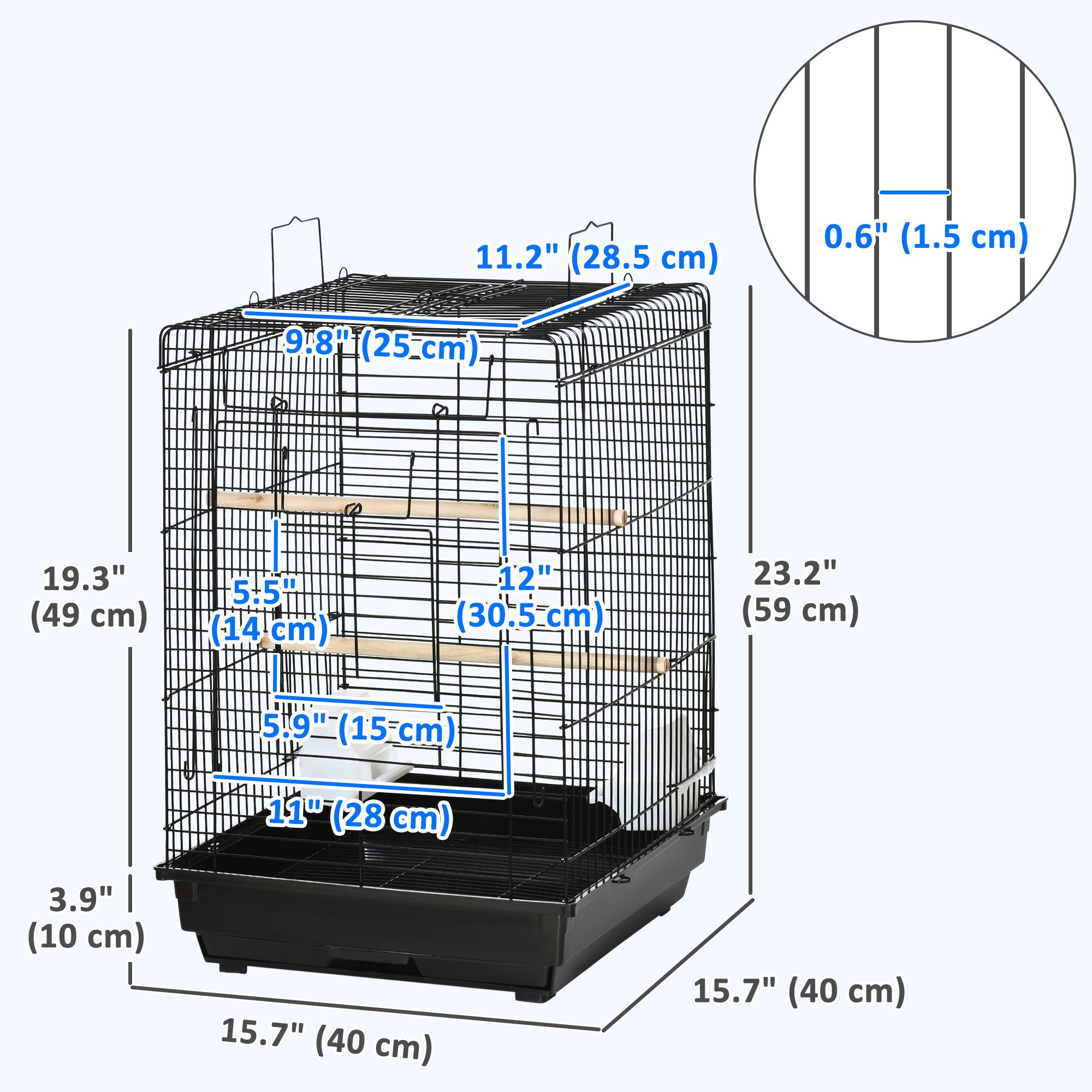 Your feathered friend will love the roomy interior and attention to detail of this PawHut 23.25" birdcage with 0.5" bar spacing. With plenty of space and added accessories, including 2 feed bowls and two wooden poles, there's always room to perch and play. Two doors allow quick access to your bird and to the bottom tray for easy cleanup. An open-top and multipurpose large top door enables your bird to relax, train, and play easily.