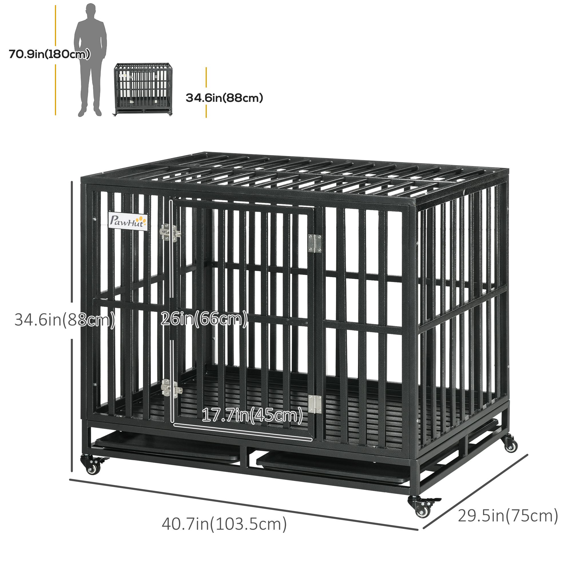 This heavy-duty dog kennel from PawHut provides a comfortable and secure home for your furry friend. Constructed with solid steel gauge tubes and frame. Each bar is securely welded to the frame for long-lasting strength and durability. Two convenient slide-out panels are included for easy cleaning and maintenance. This dog kennel has rolling caster wheels for easy transportation and movement. This crate is a great tool for keeping your pets safe and secure while you are away.