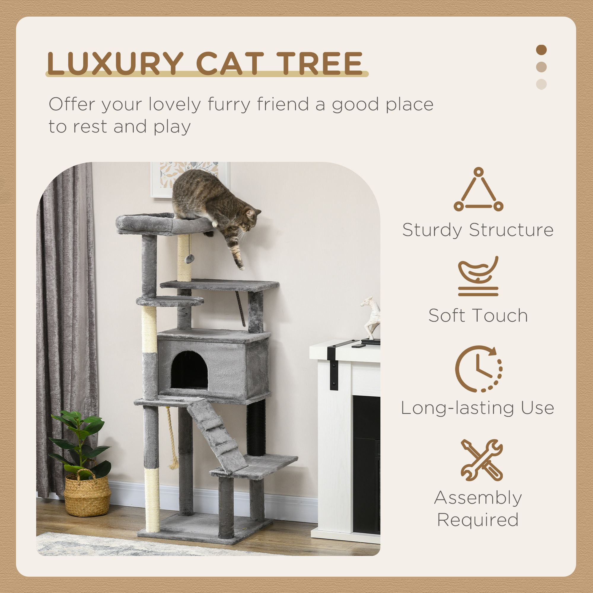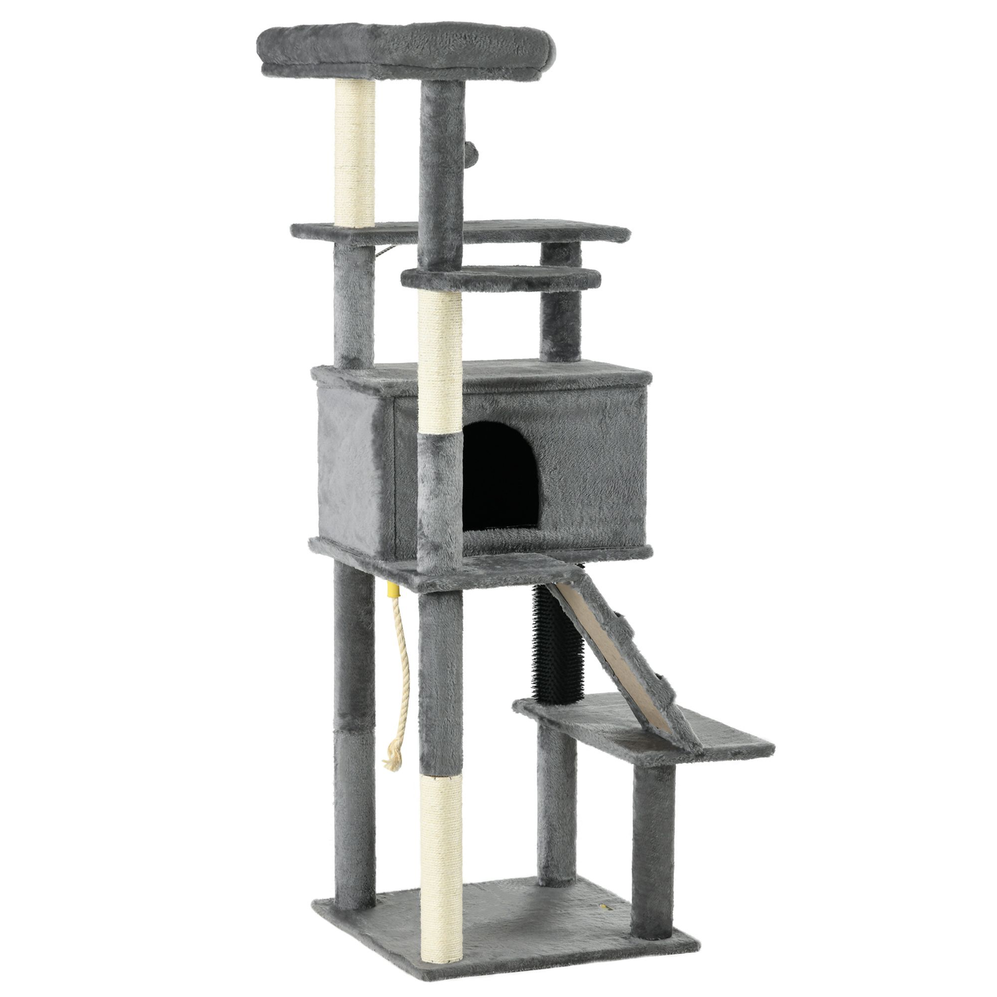 Bring your cat's world to life with the PawHut cat tree! The condo and bed provide peaceful retreats while the sisal scratching posts satisfy their natural instincts. With plush upholstery for ultimate comfort and a sturdy construction for safe play, this cat scratching tree is a blend of style and functionality. Finished with toys, keeping them entertained when alone. Enhance their world and add a touch of elegance to your room with a cat play tower where comfort meets chic!
