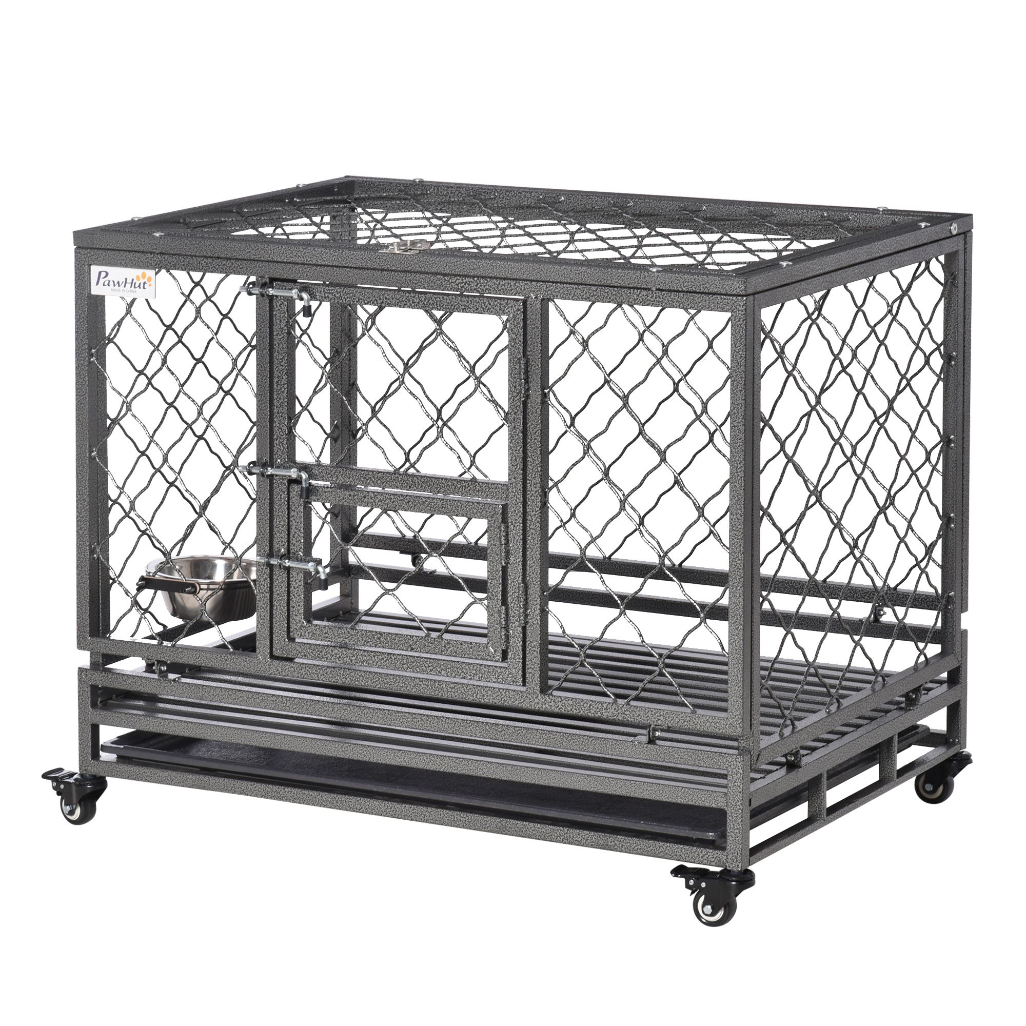 Give your furry friend a den of their own with this heavy duty dog cage from PawHut! The steel dog crate is made with steel gauge tubes frame and a steel net for a stable structure that is suitable for daily use. Each bar is securely welded to the frame for strength and stability. Keep your furry friends space clean and tidy! This kennel includes a slide out tray, making cleaning and maintenance a breeze. Move the dog crate with ease! The 4 caster wheels provide easy and effortless movement.