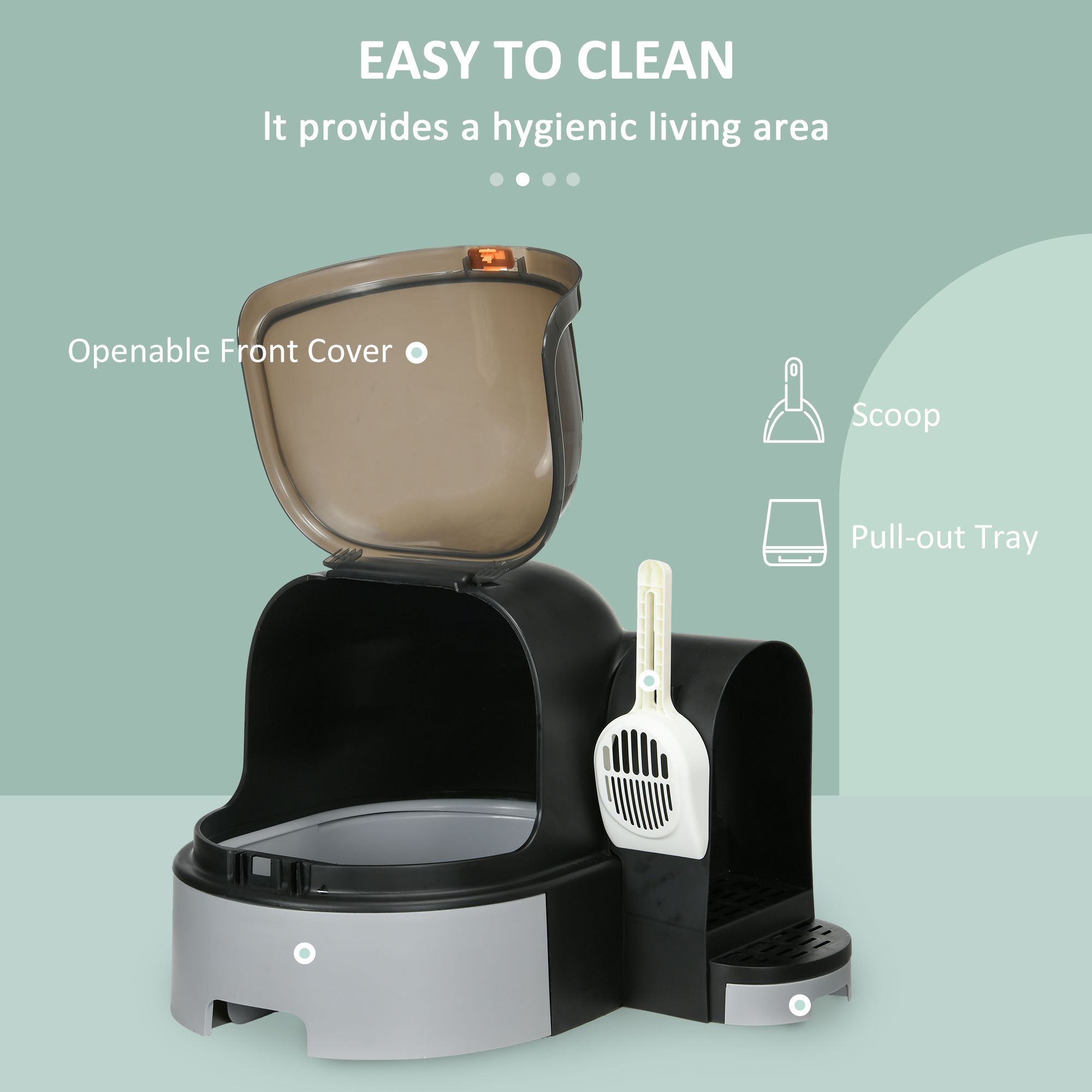 • - Easy to Clean: Our kitty litter box with lid has a removable bottom tray, and the front cover is openable. These facilitate quick and effortless cleaning, maintaining a healthy space for your cat.