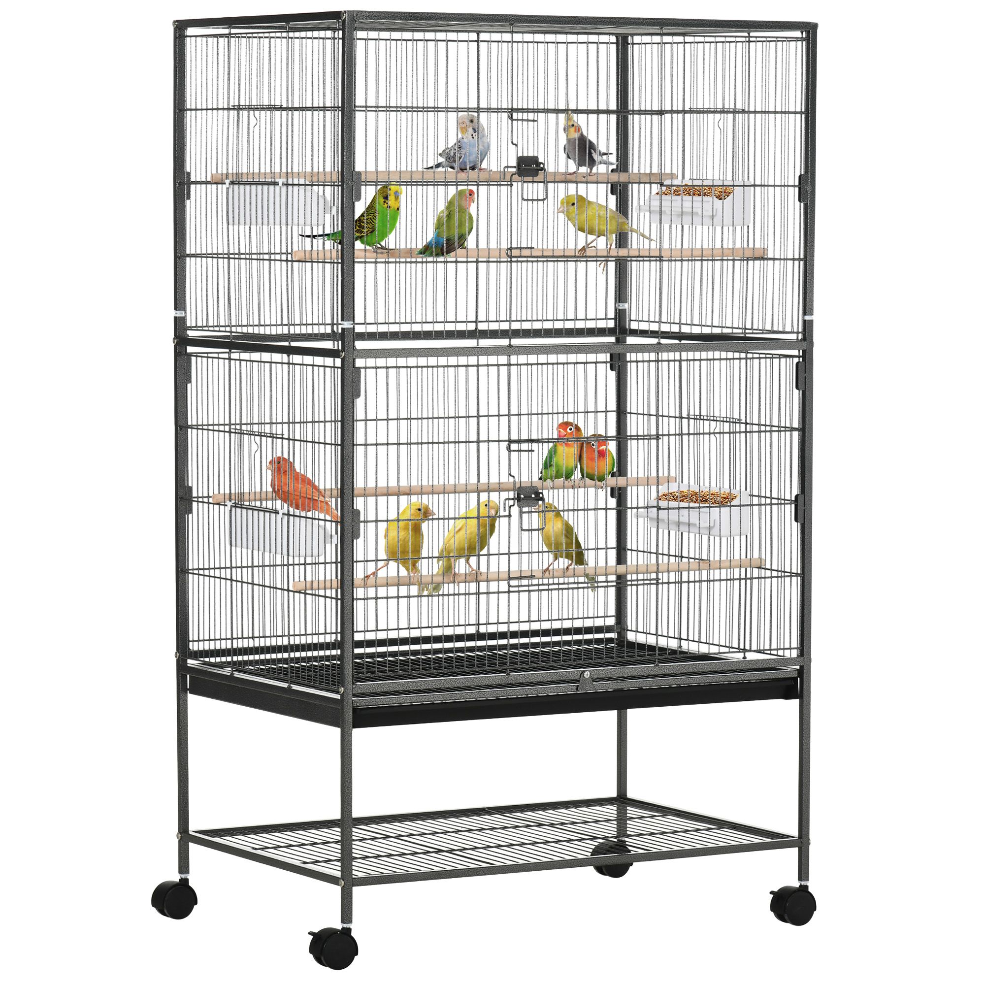 Keep your pet stimulated, safe, and happy with an indoor bird cage starter kit with a rolling stand from PawHut. Our cage provides plenty of living space and room for activity. This large parrot cage ​with wheels includes 4 perches and 4 food containers for your birds to enjoy. You'll be able to easily access your bird's food, water, and the inside area with multiple doors. The front slide-out tray on the bottom is designed to catch bird seed and slides out to make clean-up a breeze.