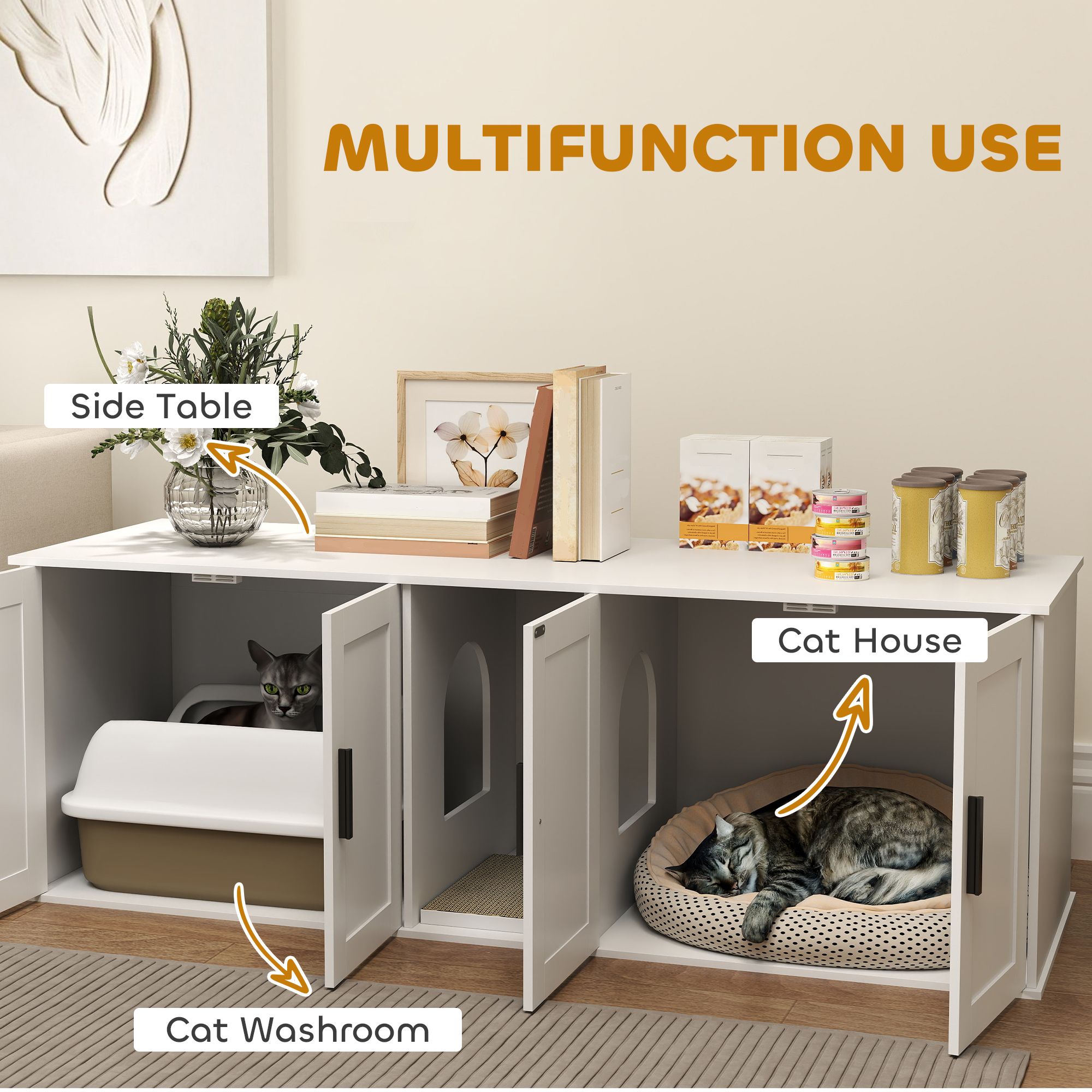 • - Versatile Cat Furniture: This multifunctional cat litter box furniture serves as a cat box enclosure, cozy cat house, and chic TV stand or end table. It blends perfectly with any home decor, from modern apartments to rustic cottages.