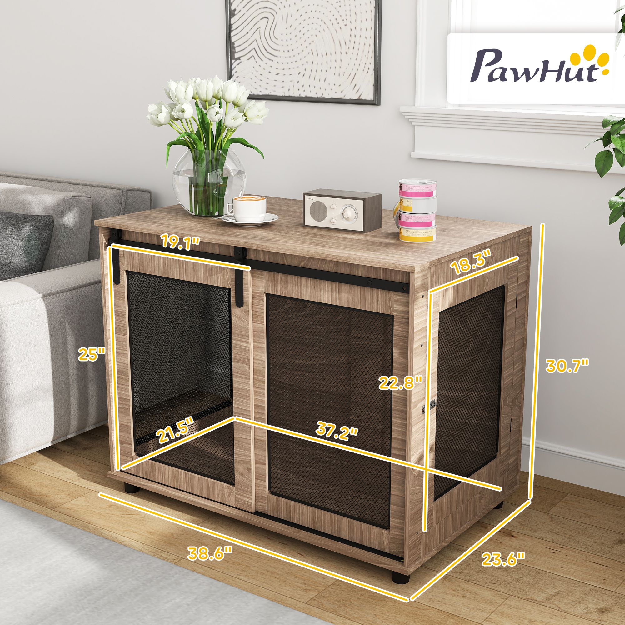 Home > 39" Dog Crate Furniture, Dog Kennel Furniture End Table with Sliding Barn Door for Large Dogs, Walnut Brown