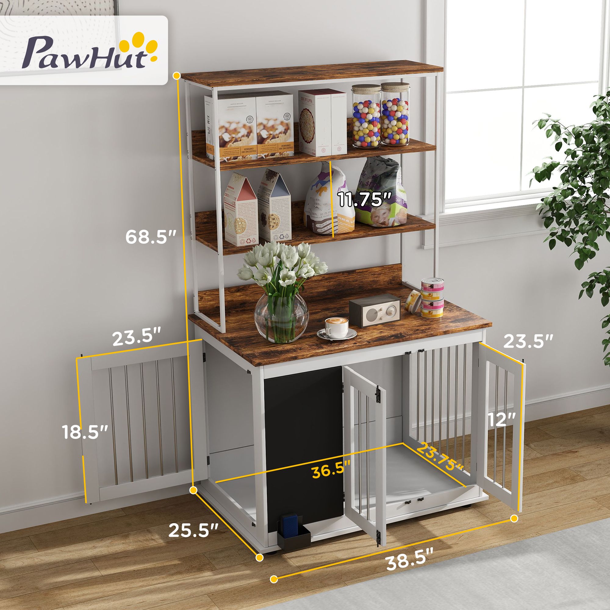 • - Dog Crate Furniture Info: Overall Dimensions: 38.6" L x 25.6" W x 68.5" H. Suitable for large-sized dogs up to 66 lbs. with a body length up to 23.6". Assembly required