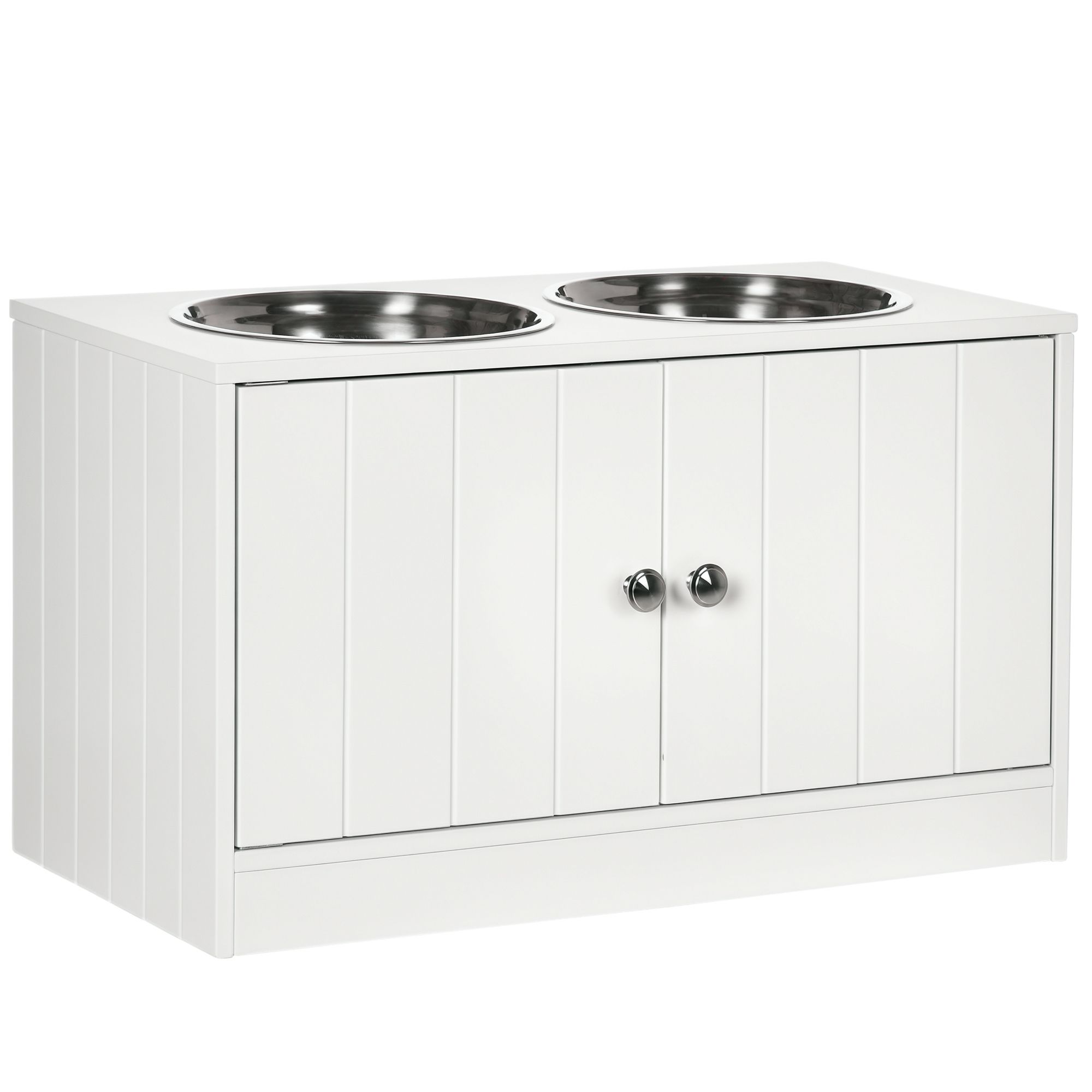 The PawHut dog bowls with a stand keep your pet's feeding area clean, organized, and friendly. This dog food stand can reduce your dog's neck, back, and joint strains. It has a sturdy MDF base for everyday use. Also, the dog feeding station has two removable stainless steel bowls for easy cleaning. There's also storage space inside - perfect for storing dog food bins and other pet supplies. The neutral colour tones of this stylish feeding station blend well with your home décor.