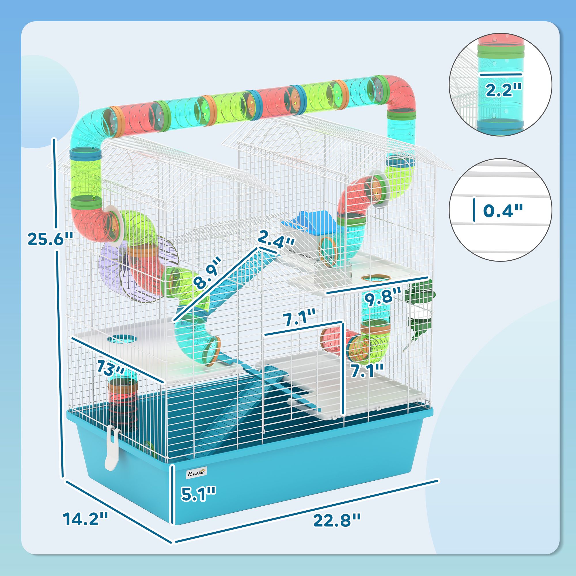 4-Tier Hamster Cage with Tubes, Exercise Wheel, Hut, Water Bottle, Food Dish, Ramps, 22.8" x 14.2" x 25.6", Light Blue