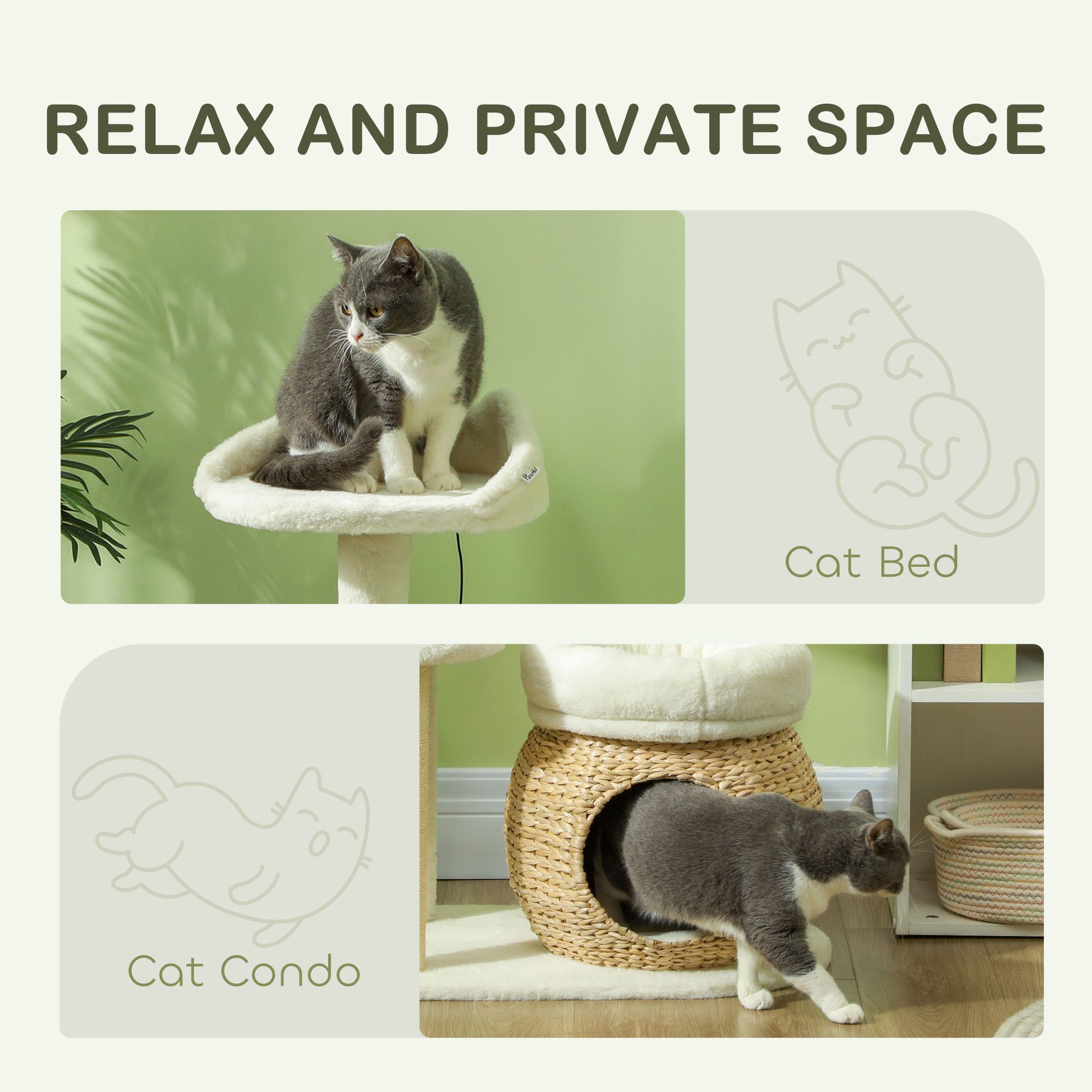 2.- Natural and Cozy: Our cat condo is crafted from natural cat tail reed. The beds and platform are covered with soft bunny-like velvet fabric, providing a comfortable and inviting space for your cat