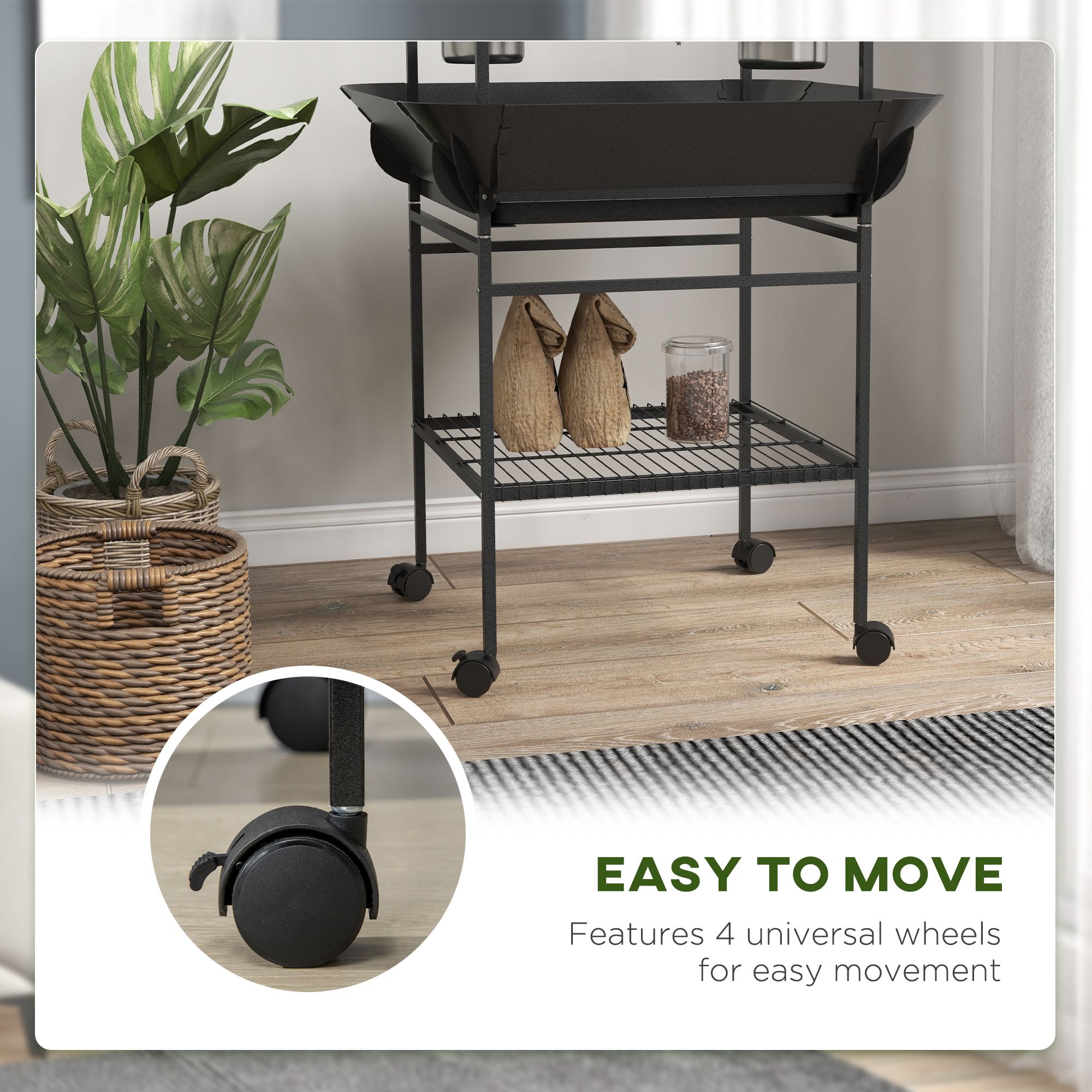 PawHut Mobile Bird Stand with Wheels Perches Stainless Steel Feed Bowls Pull-Out Tray for Small Parrot Dark Gray