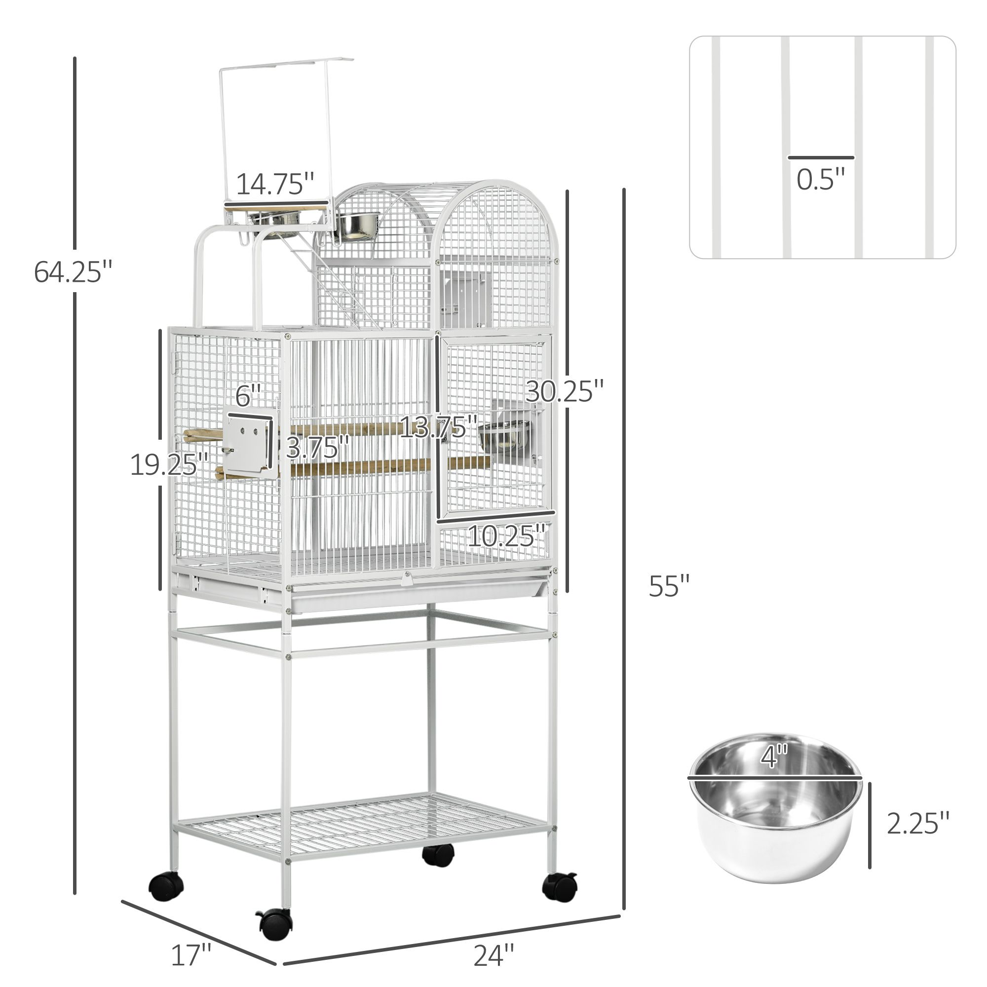 5.- Bird Cage with Stand Information: Bird cage body dimensions: 24"L x 17"W x 30.25"H (without bird stand and rolling stand). Number of Doors: 4. Door size: 10.25" x 13.75" (front), 6" x 3.75" (side). Bar spacing: 0.5". Suitable for cockatiels and similar size.