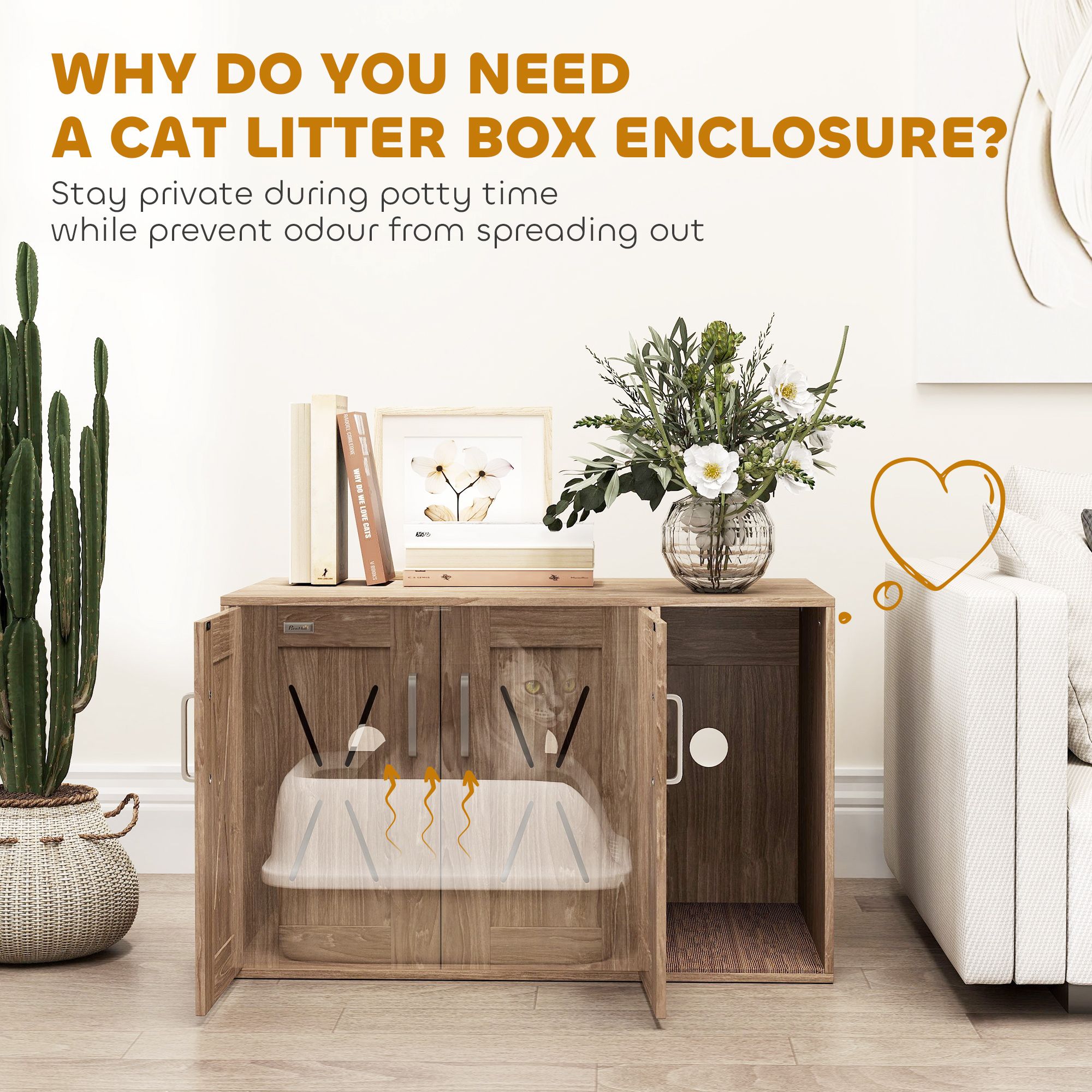 • - Strong, Easy-to-Maintain Design: Made from particleboard with non-slip foot pads, this litter box enclosure is built to last. Its easy-to-clean surface ensures minimal effort in maintaining a tidy and hygienic space