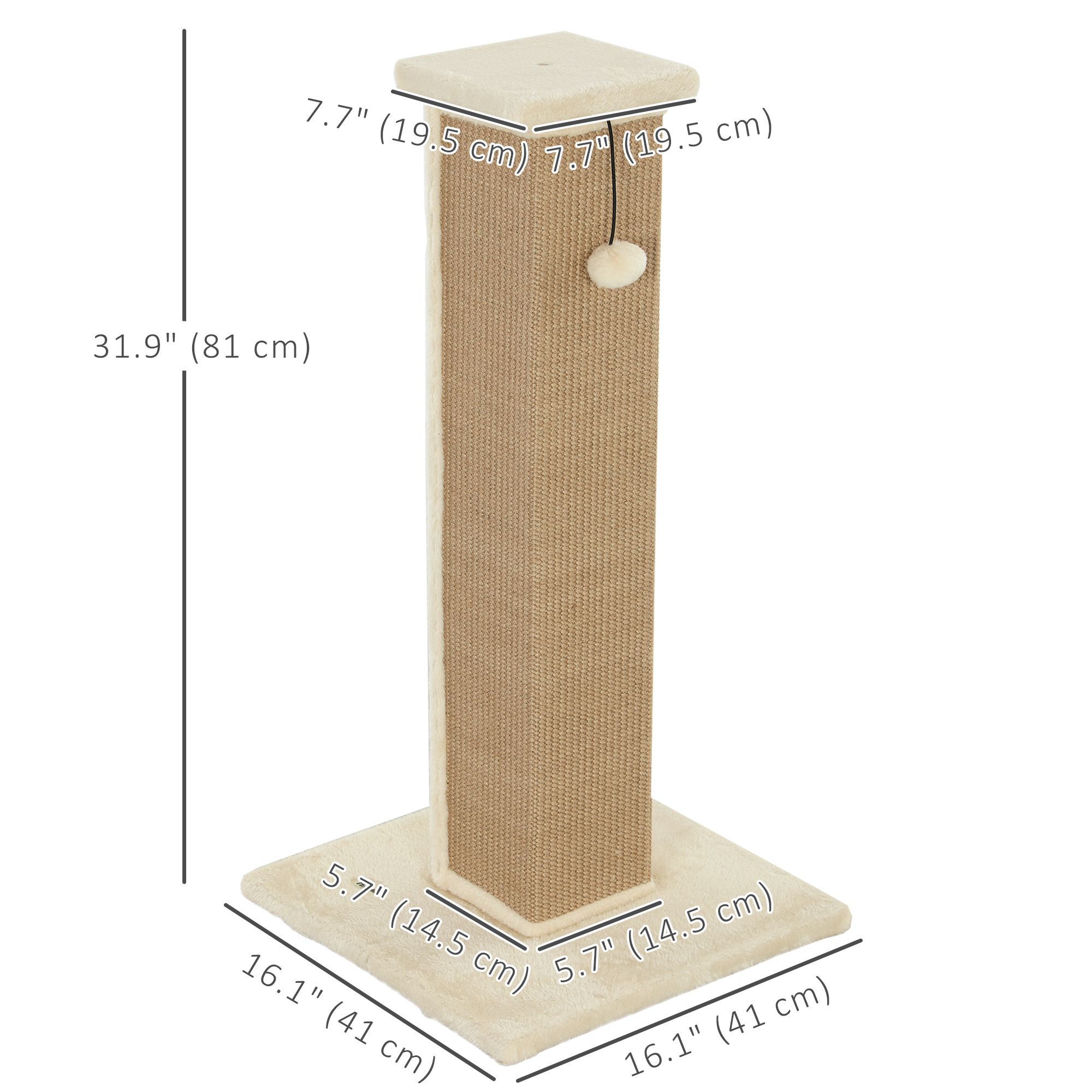 32" Tall Cat Scratching Post for Indoor Cats and Kittens, Sisal Cat Scratcher with Hanging Ball Soft Plush, Beige