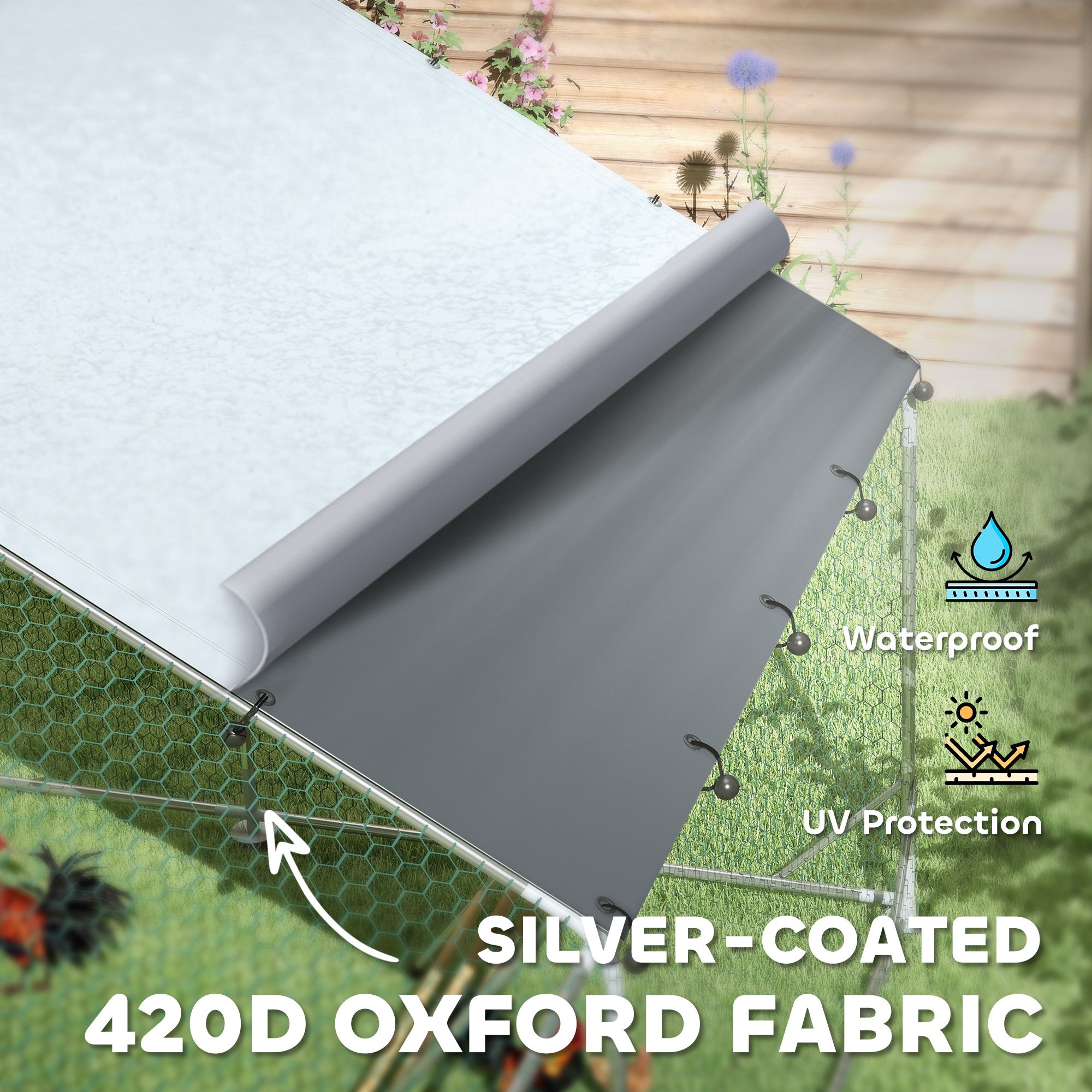 • - Top Protection: Equipped with 420D silver-coated Oxford cloth that is waterproof and UV-resistant. The slanted roof prevents water accumulation, keeping your feathered friends warm and dry in any weather with this chicken cage