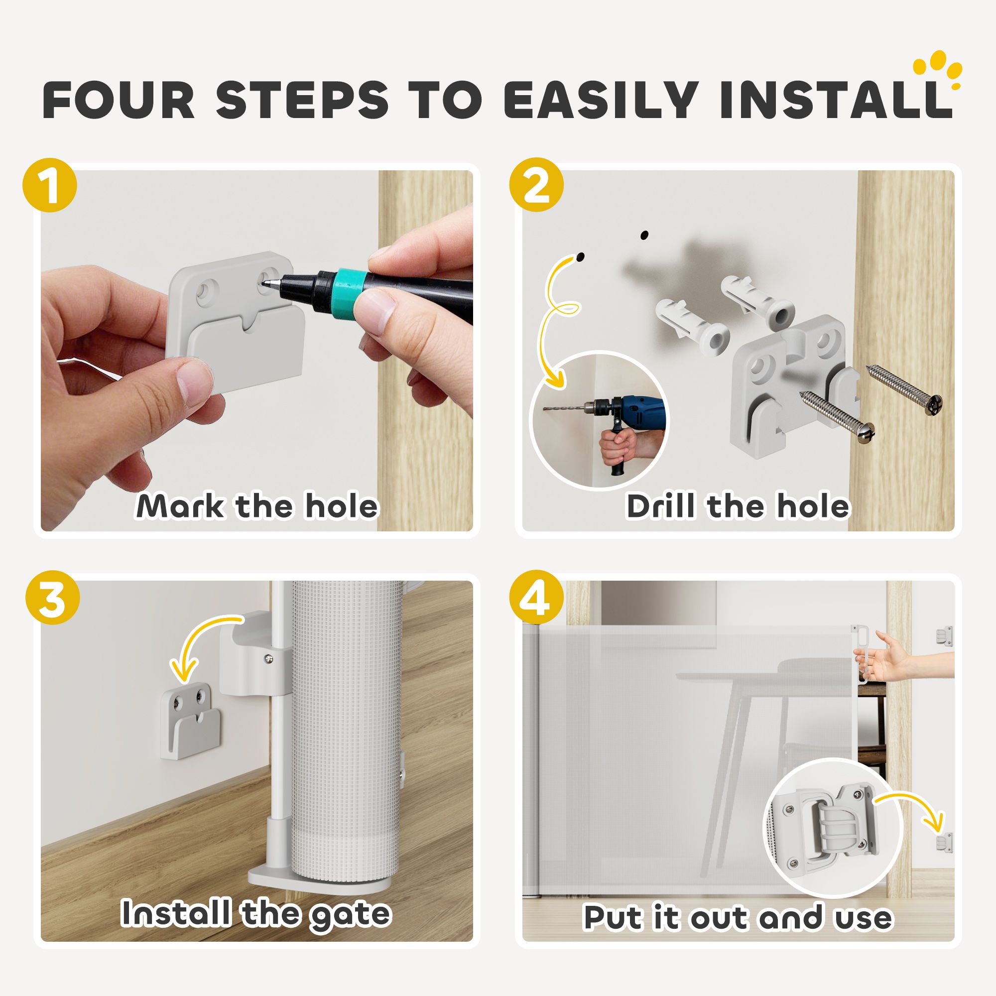 Discover the PawHut Retractable dog gate for stairs, a seamless blend of safety and convenience for your furry friend. Designed for doorways up to 140 cm wide, this pet gate features a soft, plastic-coated mesh that protects your pup from bumps. Installation is a breeze, and the locking switch keeps the gate securely extended or neatly rolled away when not needed, ensuring a safe, adaptable barrier.