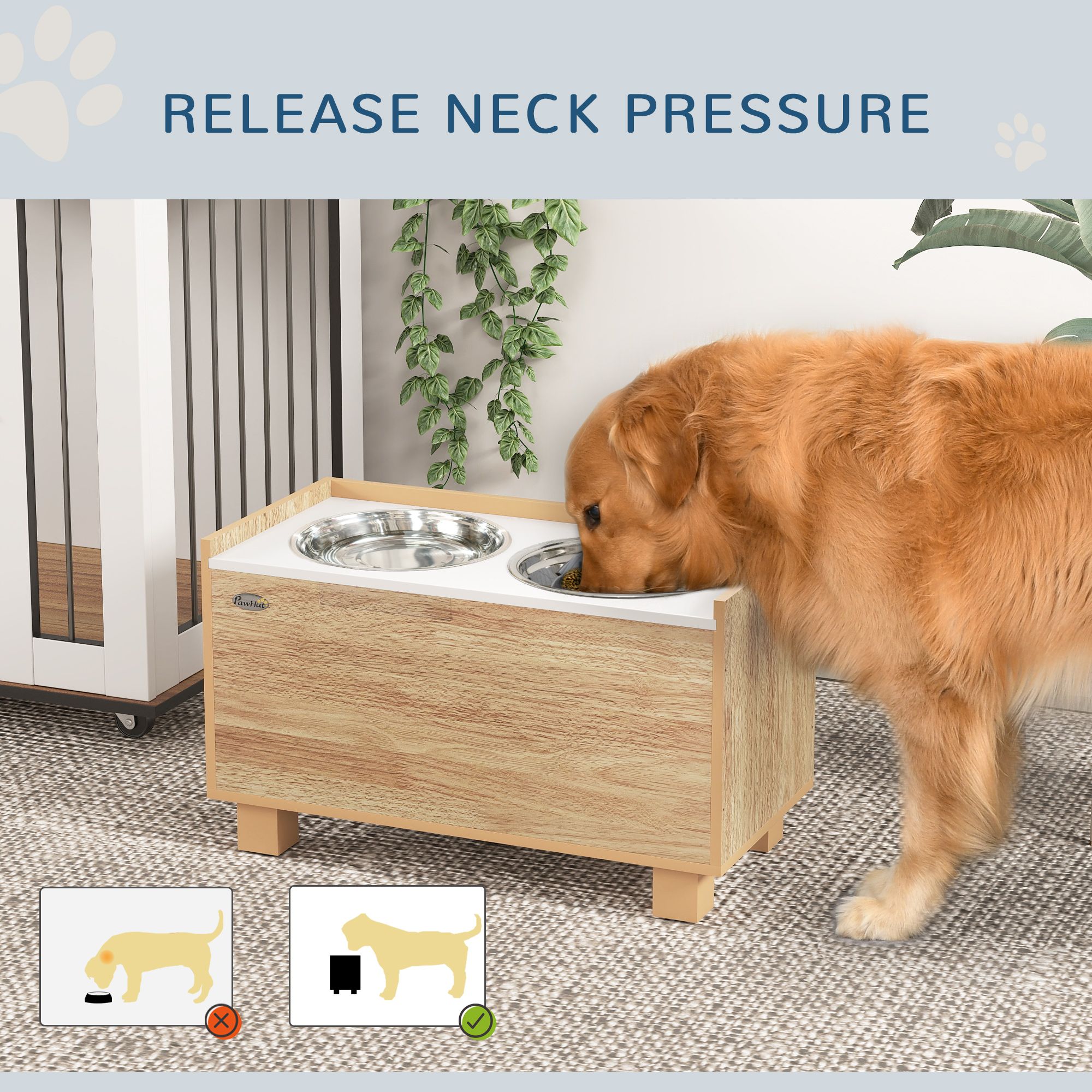 • - Elevated Comfort: Raised design tailored for large dogs to aid digestion and reduce joint strain by allowing them to eat at a more natural height.
