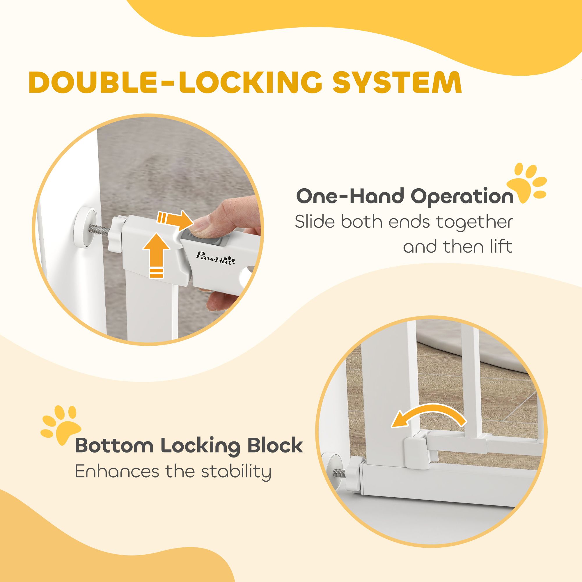 Keep pets away from rooms when required with the Pawhut dog gates with walk through door. Made from metal with lead-free treated surface for strength and safety. Ranges from 29.5" to 40.6"(75 - 103 cm) wide, allowing it to fit into different sized spaces with ease. Slide and lift, the handle is easy to open, allowing you to pass through quickly without your pet escaping for security. Double locking mechanism ensures your pet secured in a place to provide maximum safety.
