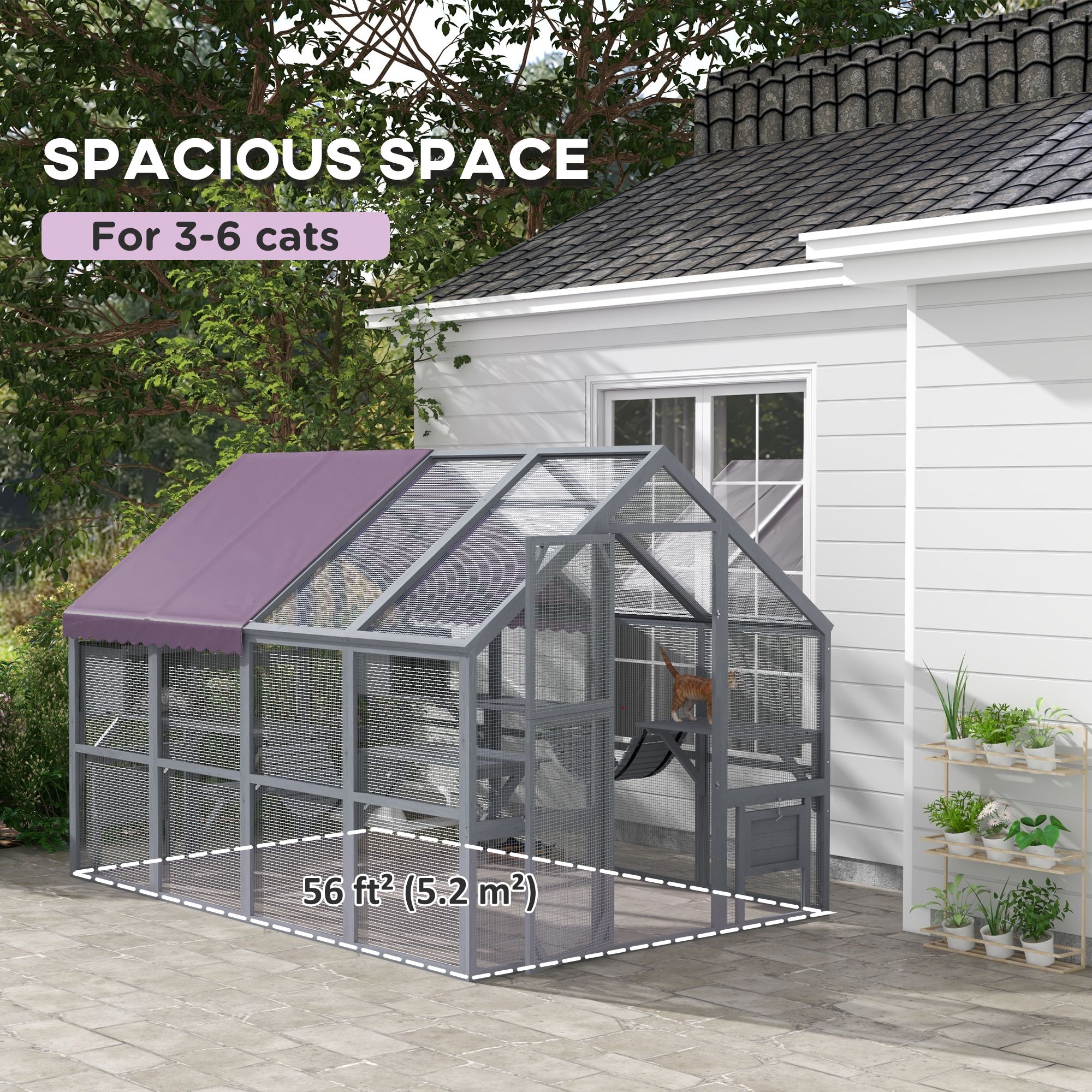 • • Spacious 56 ft² (5.2 m²) area comfortably fits 3-6 cats, each up to 18 lbs. (8 kg)